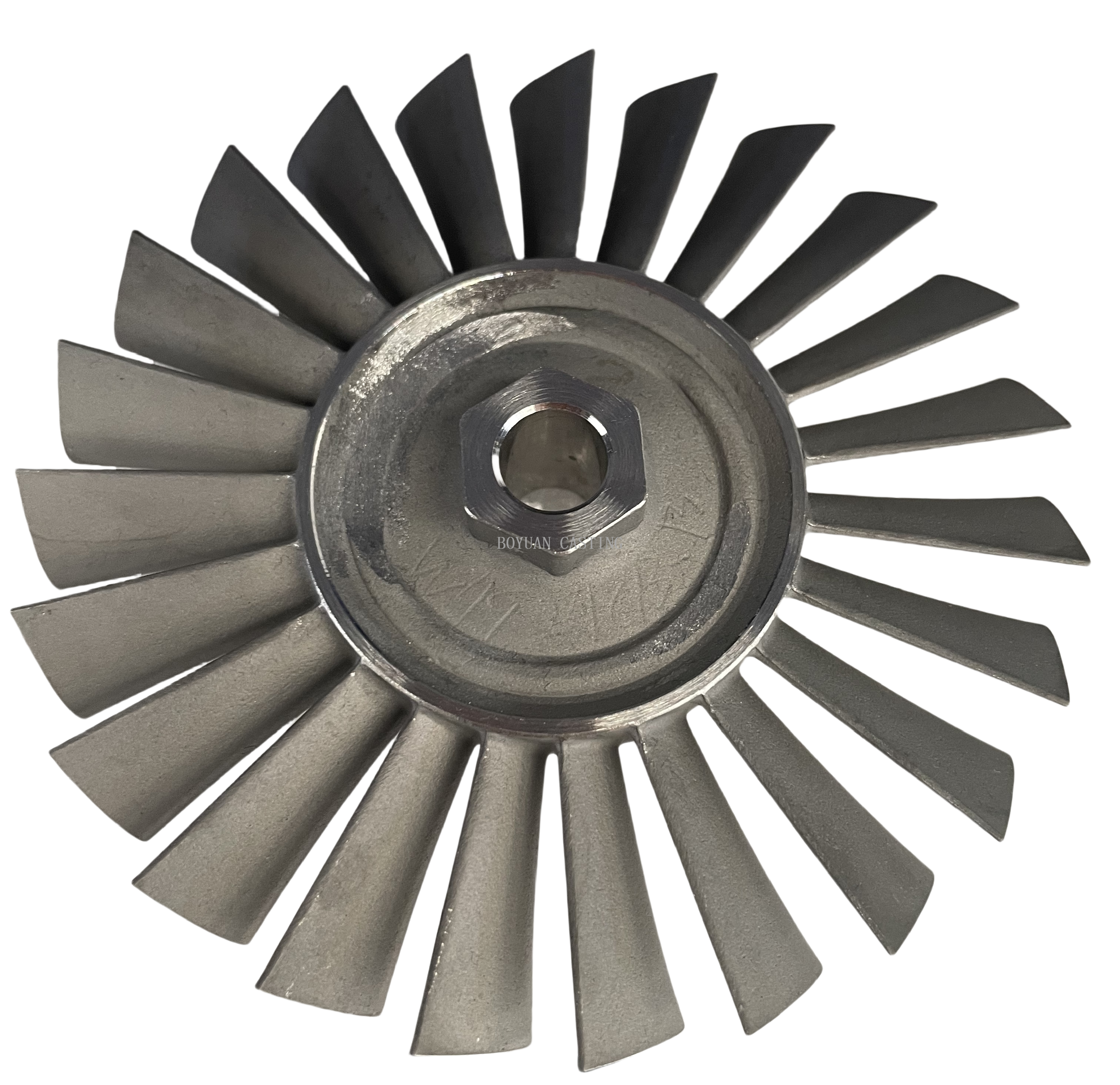 Superalloy turbine wheel used for Locomotive and Marine turbocharger, turbo turbine wheel be finished by integral casting. And casting method of turbine wheel is lost wax  investment & vacuum casting, casting surface smoothness can meet Ra3.2μm, production process of turbine wheel is Silica sol process. The blade thickness is 0.5mm. For turbine wheel, we can do thw kinds of type: radial turbine wheel and axial turbine wheel.